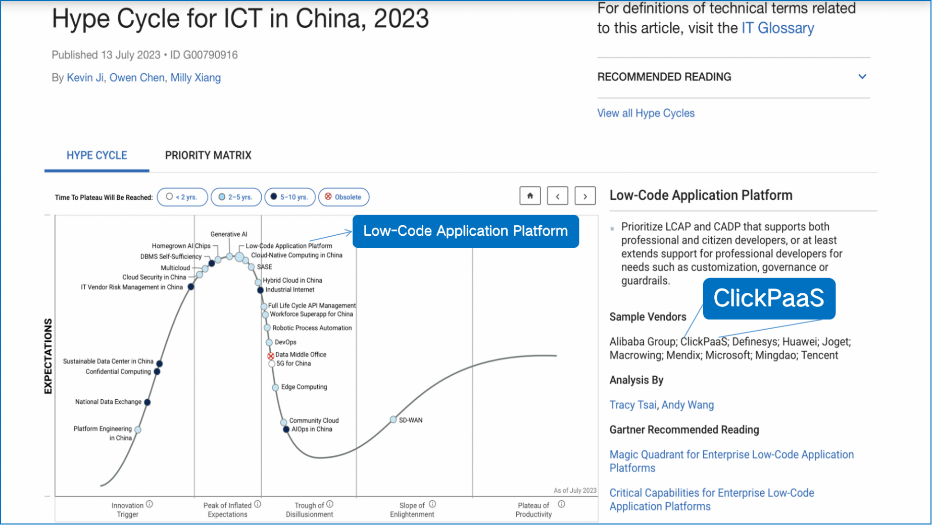 近日,国际权威研究机构Gartner发布了《Hype Cyple for ICT in China,2023(2023年中国ICT技术成熟度曲线)》报告,凯发k8官方网站登录凭借平台的aPaaS+iPaaS+DaaS保障业务系统的一站式设计,多租户、热发布、国际化、信创安全等特性实力登榜,并作为低代码PaaS平台代表厂商TOP2入选本次报告。
